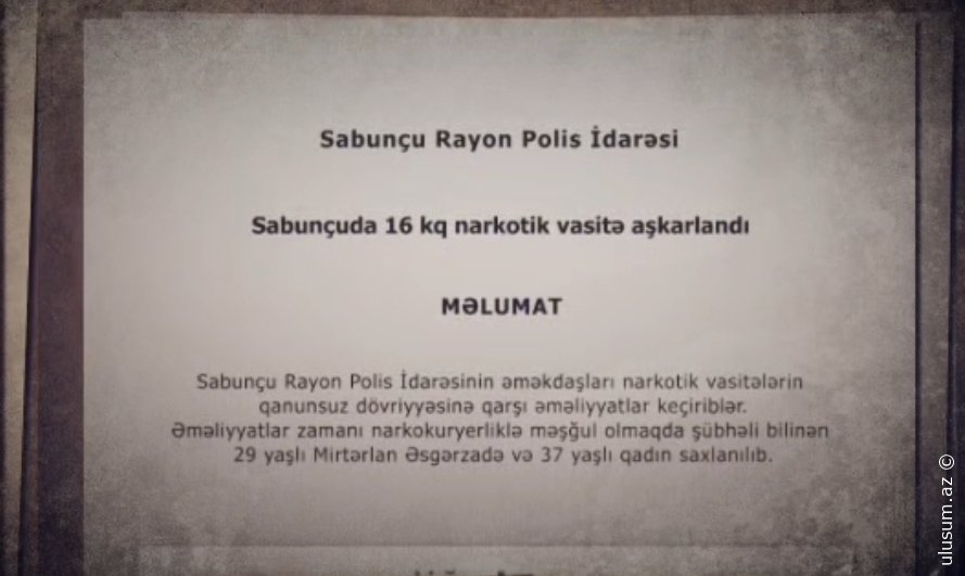 Onların üzərindən və yaşadıqları ünvanlardan ümumi çəkisi 16 kiloqramdan artıq olan, tərkibinə psixotrop maddələr əlavə edilmiş marixuana, metamfetamin və tiryək aşkar edilərək götürülüb.