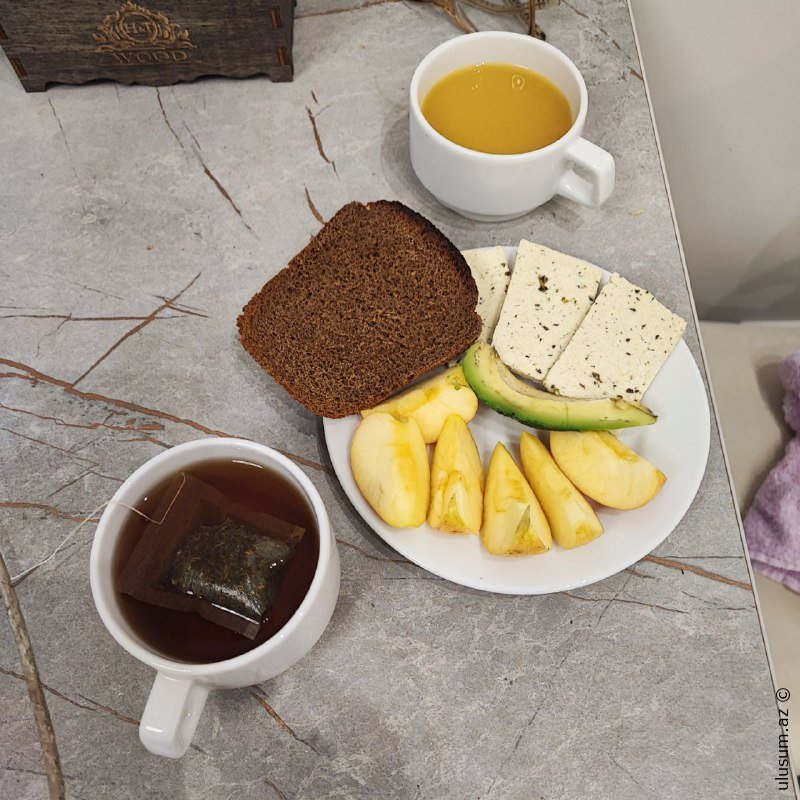 - Kiçik qəlyanaltılar: qara çörək, avokado, alma, tofu
