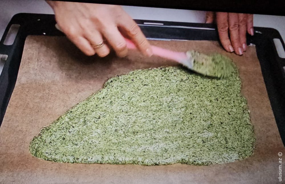 5. Hazır qarışığı perqament kağız sərilmiş listə (təxminən 22x23 sm ölçüdə) yayaraq bərabər səviyyədə yayın.